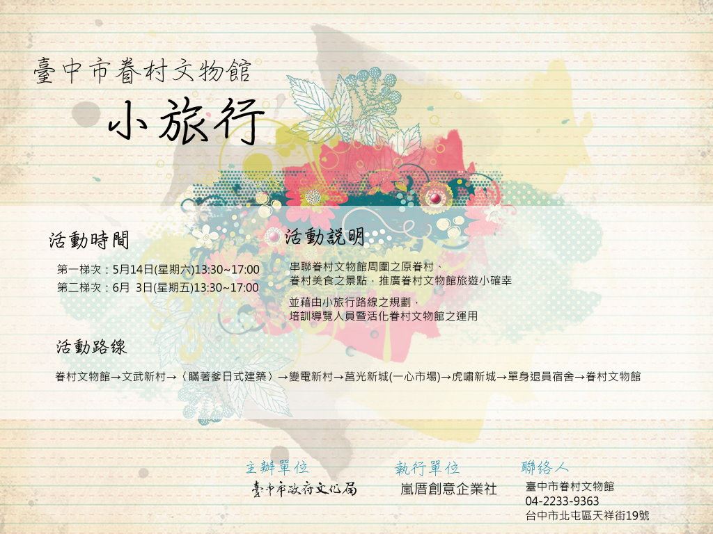 為活絡臺中市眷村文物館,讓臺中市民可以更加認識臺中市市眷村文化,而舉辦小旅行計畫。