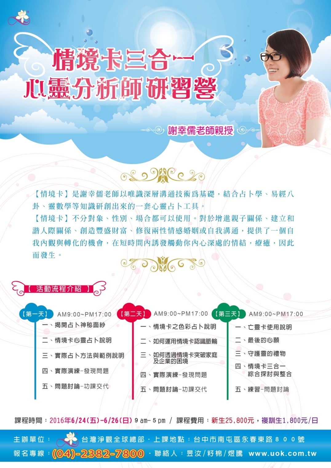 這三天我回來複訊,使自己對課程內容都完全了解.....在日後的情境卡運用一定會有很大的幫助。師母在課程中活靈活現的解牌技巧讓我讚嘆不已,更發現了情境卡的運用可以延伸至波動儀檢測,是身為一個溝通師必備的技能,也是每一個人都能傭有的一個溝通工具,每一張小小的卡片裡,都蘊含了師母畢生所學習的技能之精華在裡面,包含了色彩占卜、脈輪、圖畫、情緒學…..真的也是值回票價!而我更期待自己日後好好的運用情境卡,為生活帶來更多更精采的體驗。