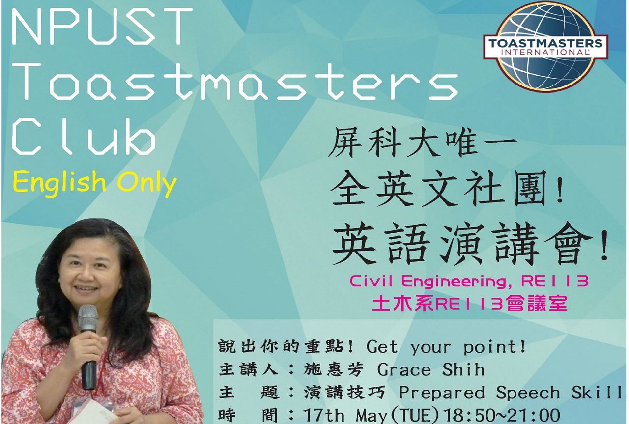 題目:如何準備英語演講,並讓人知道您想表達的重點!時間:五月十七日 晚上七點到九點地點:土木系二樓會議室RE113【屏科大英語演講會粉絲團】https://www.facebook.com/52npust/