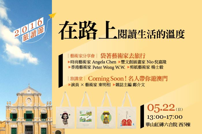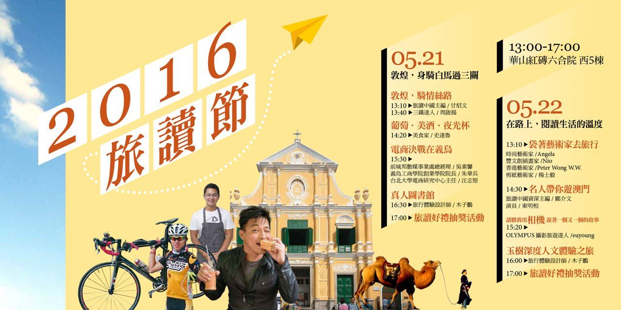 旅行,是件美好的事。讓名人、演員、達人及藝術家帶你旅行去,一邊描繪兩岸四地人文與風景,一邊閱讀城市地圖與故事,只要你大膽想像,就能創造旅行中難忘的時光。2016旅讀節,是我們旅行的起點站,華山紅磚六合院西5棟不見不散!