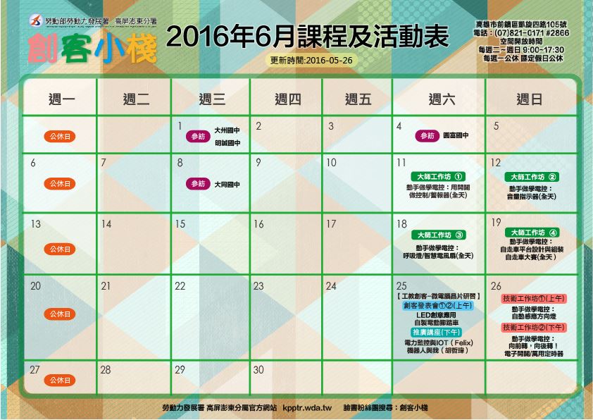 以上課程地點皆為: 勞動部勞動力發展署高屏澎東分署-創客小棧 (806高雄市前鎮區凱旋四路105號)。