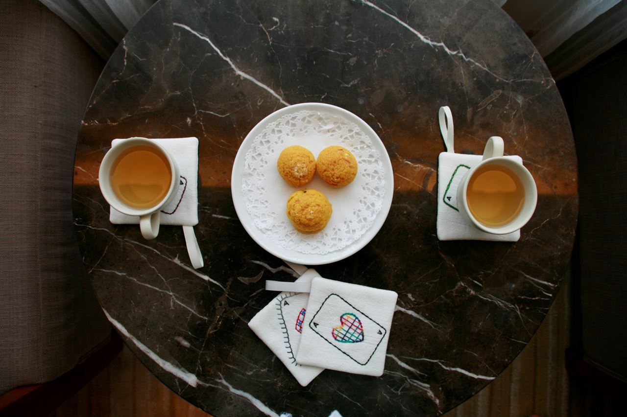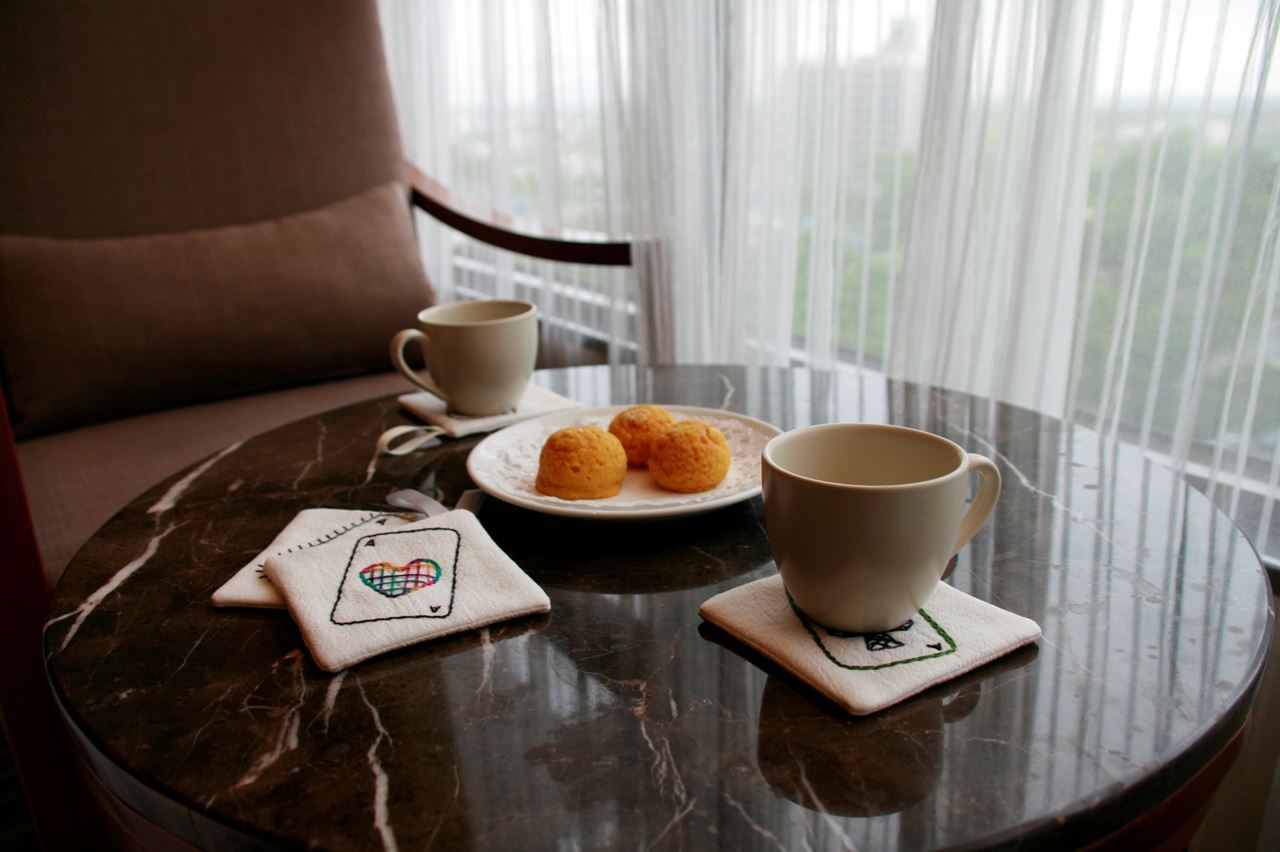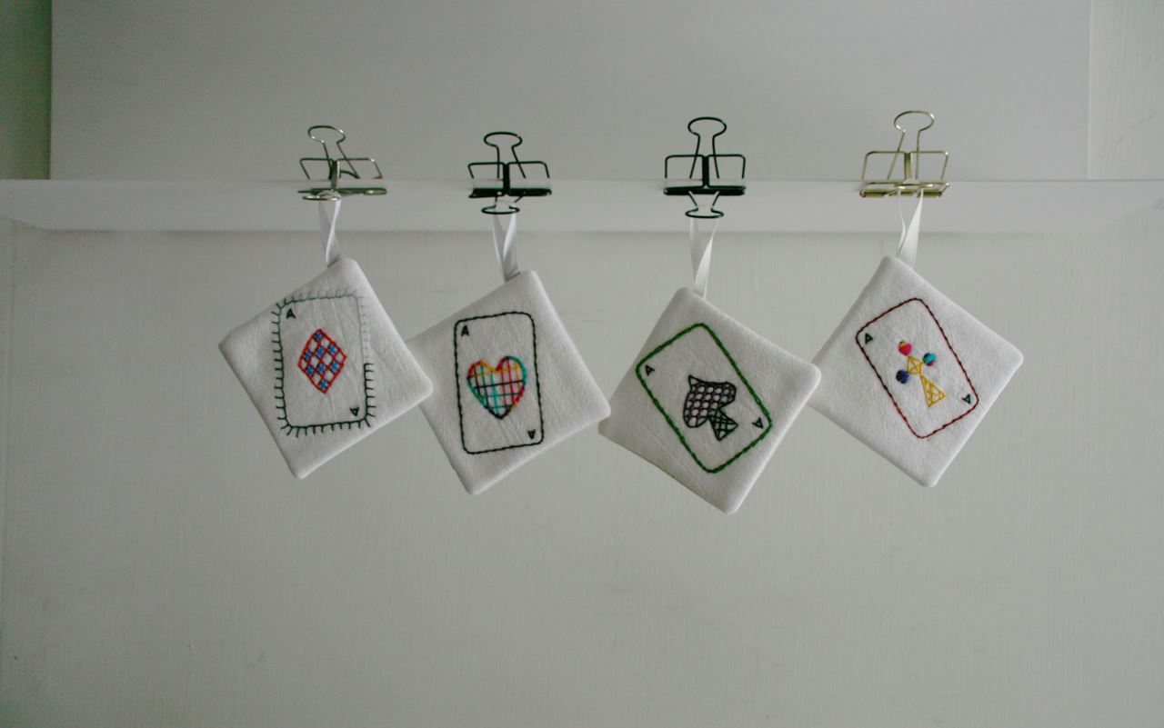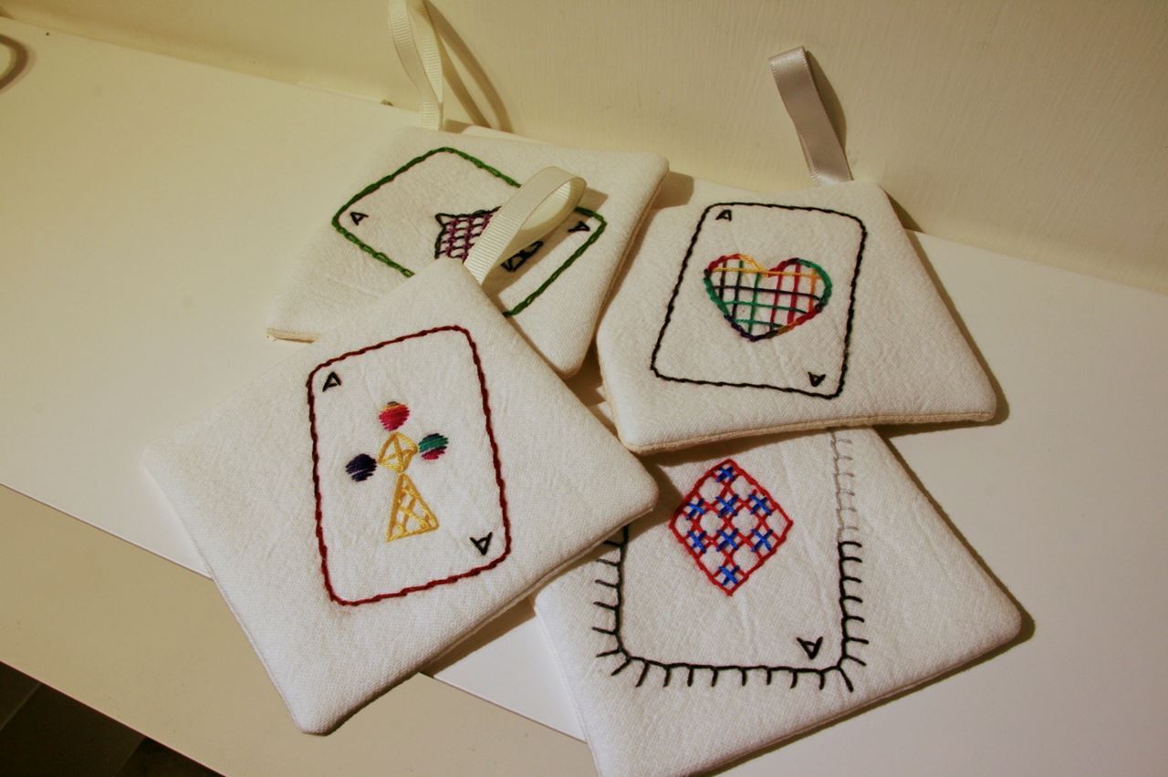 六月的手作風格工作坊,以亜麻布料為主要材料,搭配色彩豐富的繡線縫上趣味的撲克牌黑桃、紅心、方塊、梅花Ace圖案。帶領大家體驗一針一線的溫暖與屬於自己獨一無二的小作品,每位參加體驗課程的學員會完成一個約10x10公分大小的杯墊成品。
