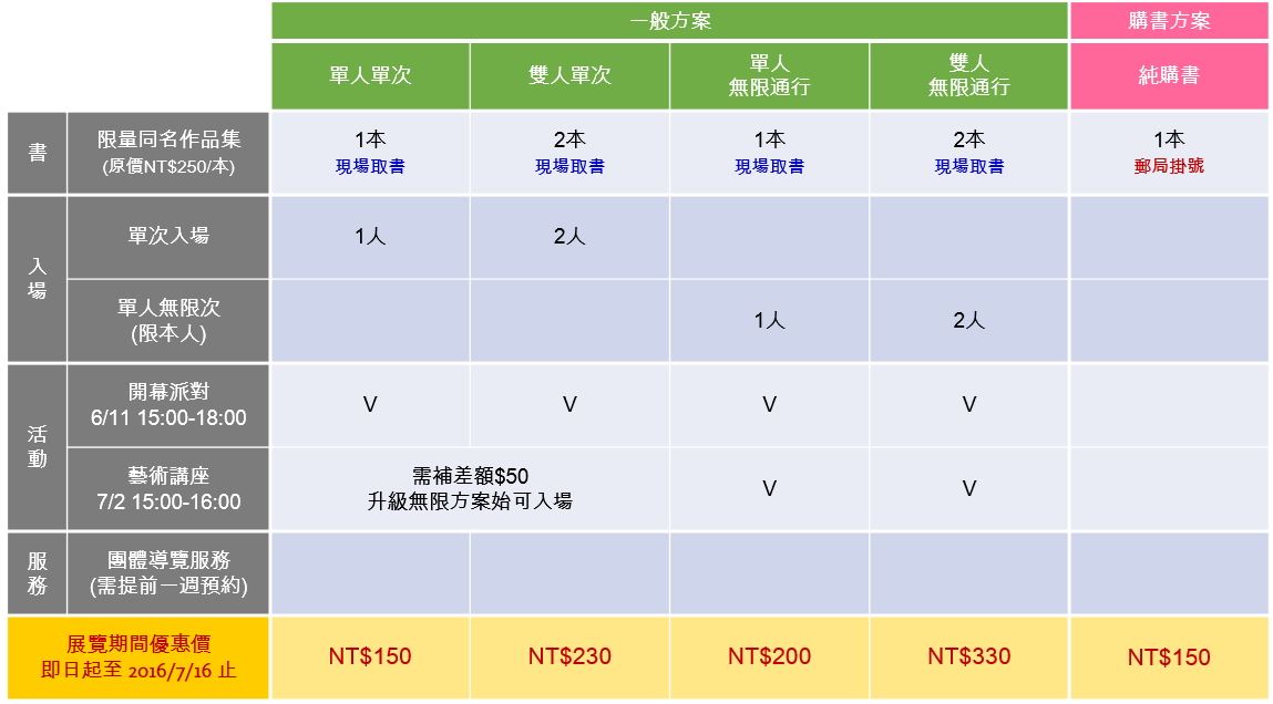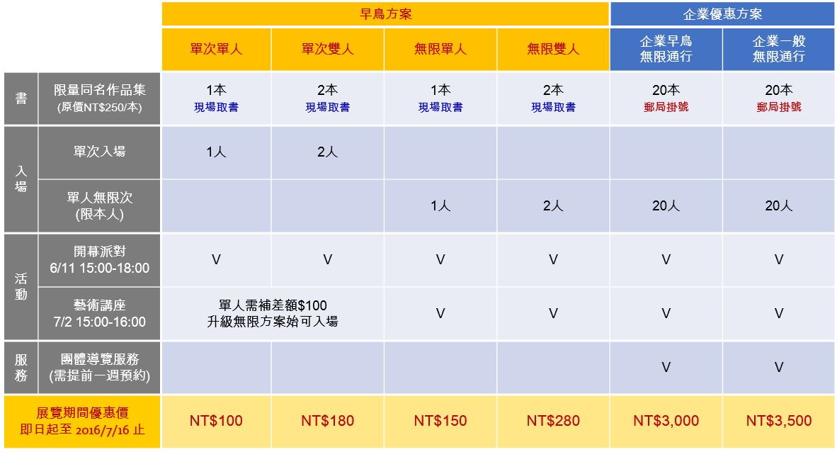 - 一般方案觀眾亦可至藝廊現場補差額升級為無限方案。
