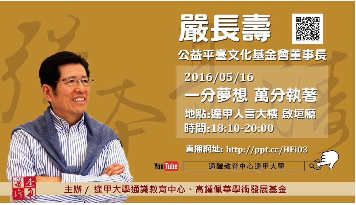 逢甲大學通識中心強本高濤系列課程 X 嚴長壽總裁「一分夢想、萬分執著」演講Youtube線上直播
