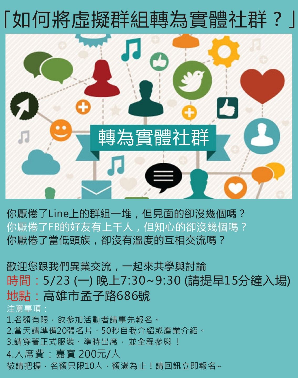2.當天請準備20張名片、50秒自我介紹或產業介紹。
