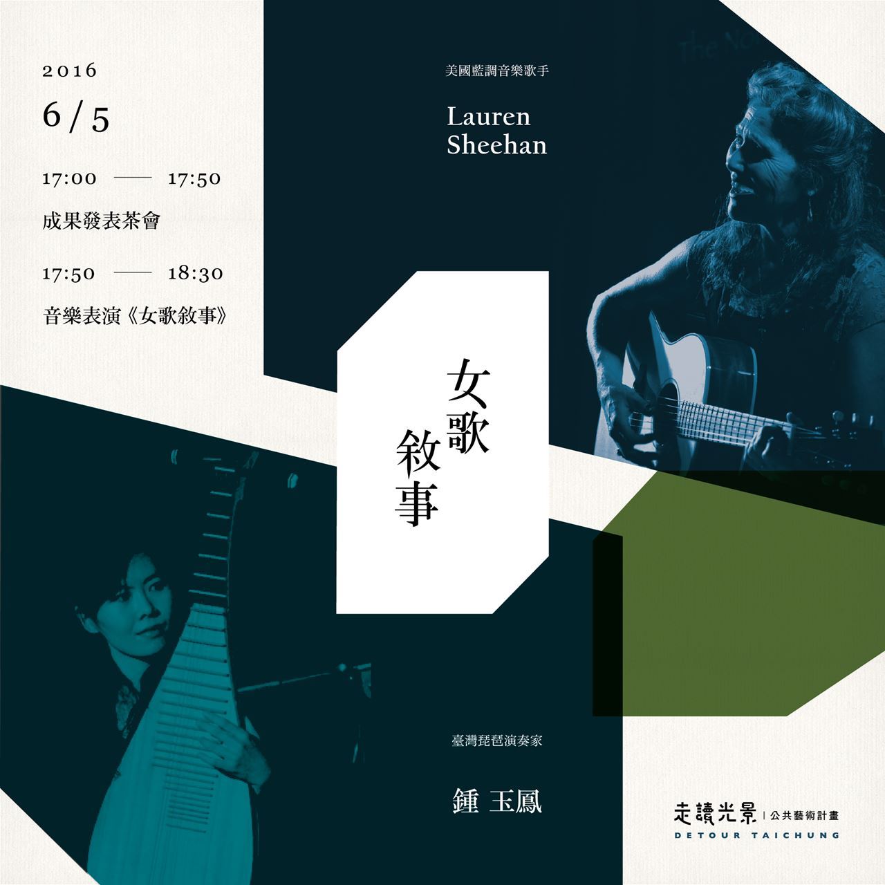 Lauren Sheehan,以柔美嗓音與精湛的撥弦,挑戰陽剛的藍調與草根鄉謠,大膽重組美國民謠史上黑白民歌數世紀層疊的風景,披荊斬棘以女歌敘事。首次來台的Lauren,遇上將藍調音階與唱答,轉譯爲琵琶上的顫動與呼喚,在傳統的流離路上,混血出無法定類的「藍。掉」的鍾玉鳳。
