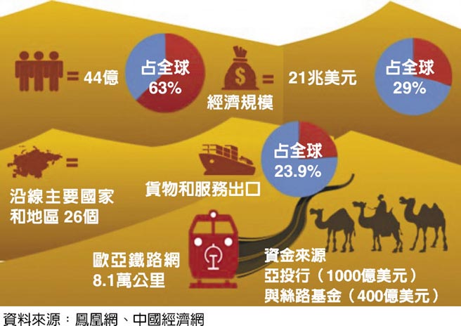 以海、陸絲綢之路貫穿歐亞大陸,目的在建立中國與中亞、歐洲等區域的貿易運輸新聯繫,由國內進而推升到國際面向的開拓。