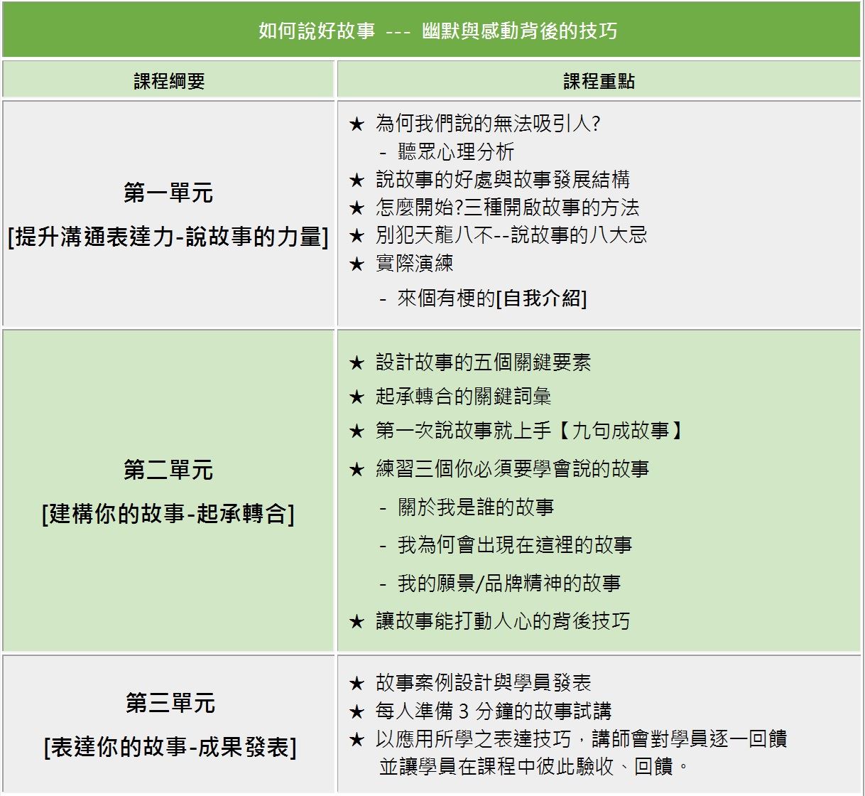 協助學員學會如何說故事與設計故事,讓說話更加吸引人!