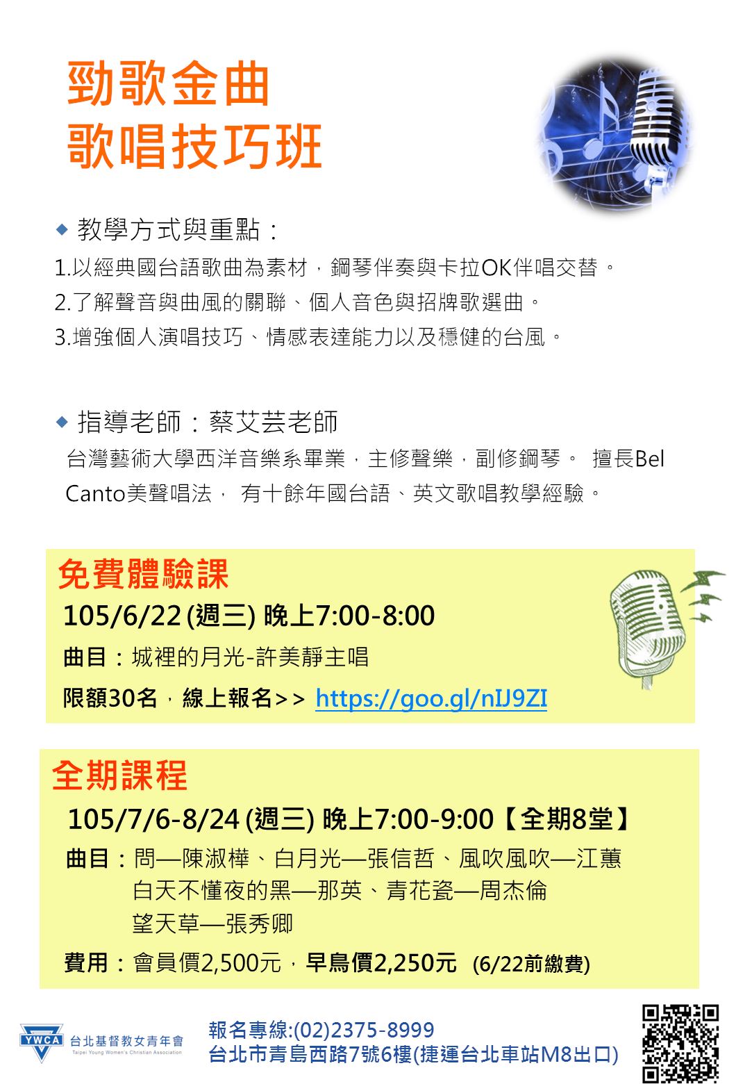 免費體驗課 105/6/22 (週三) 晚上7:00-8:00 曲目:城裡的月光-許美靜主唱 限額30名,線上報名>> https://goo.gl/nIJ9ZI台北基督教女青年會台北市中正區青島西路7號(捷運台北車站M8出口)報名專線:02-2375-8999