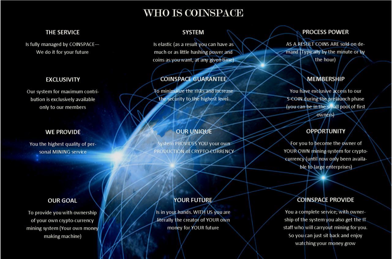 CoinSpace you have the opportunity to get in now and earn Crypto Coins every day from our strategic mining efforts. We have combined network marketing with crypto currency mining to bring you an opportunity that is second to none.