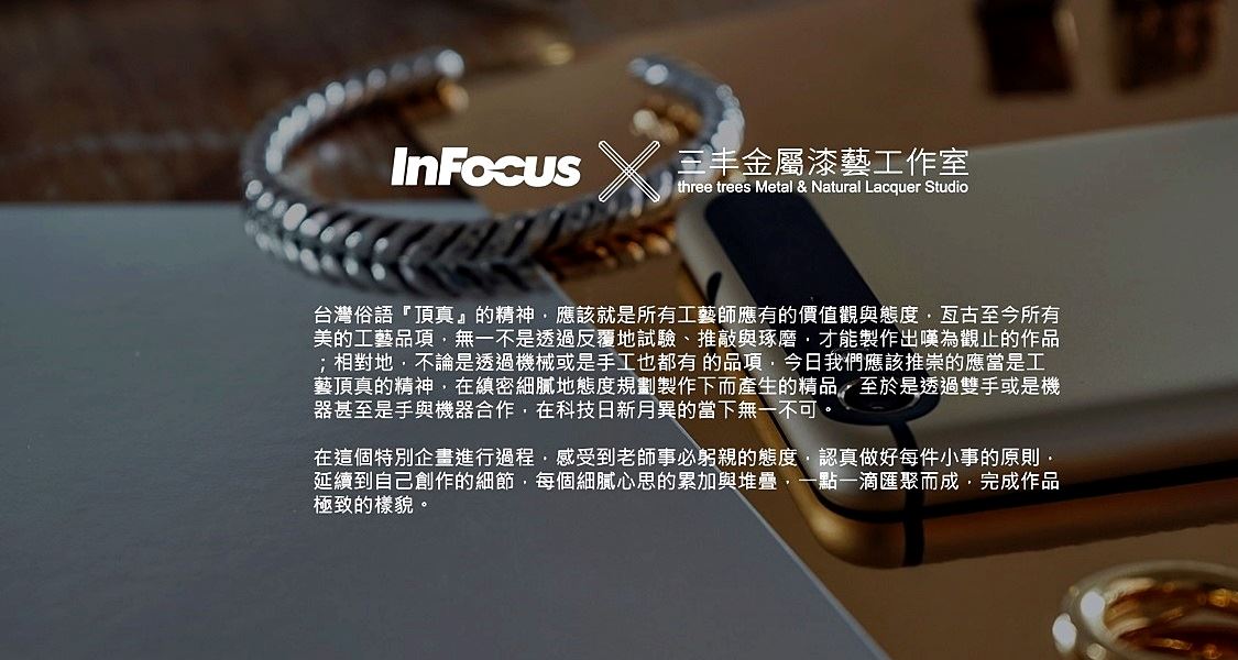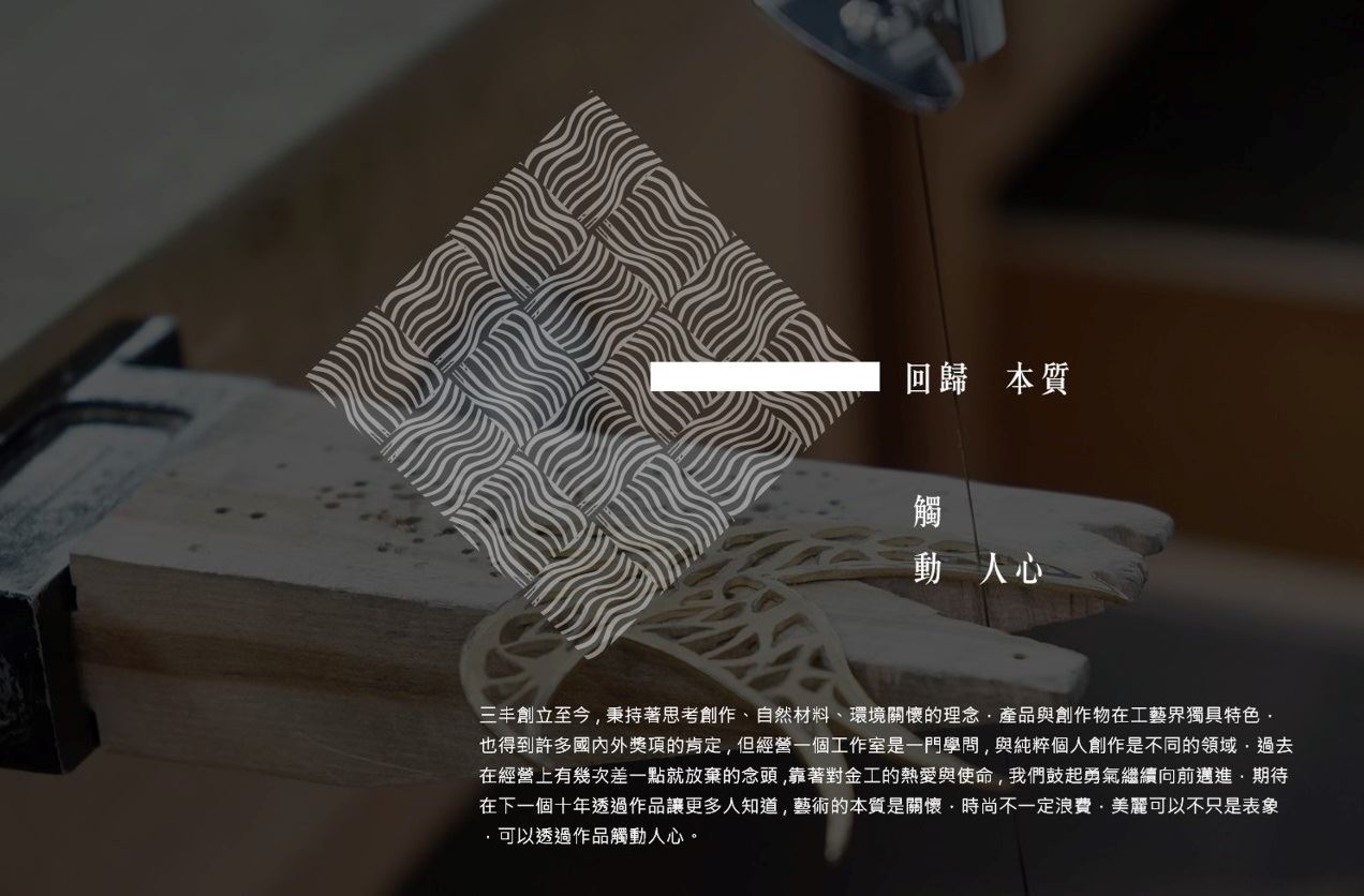 三為「多」, 丰即「木」, 三木為「森」, 意寓萬木茂生。 許一個美好的世界”三丰堅持採用不造成汙染、可回收不浪費的金屬材料及無毒素、不殘留的天然樹漆來創作,創作過程所需的加工經審慎篩選,努力地向EPR邁進。本持著「思考.創作」、「自然材料」、「環境關懷」的理念,希望透過創作告訴世界, 藝術的本質是關懷, 時尚不一定浪費, 美麗可以不只是表象。 三丰融合金屬工藝、天然漆藝、竹籐編織…等傳統工藝素材與技法,產出台灣文創商品,除了在工藝上的教學傳承與設計創新之外,並執行多次的文化部、工藝中心與文化局的計畫案,如:台灣俗語寫藝文化生活-意象產品之創作、高雄金工精緻新時尚-多角化社區工藝扶植計畫、大高雄地區金屬工藝產業普查計畫…等, 並曾於2009與2010年良品美器C-Mark認證中,拿下五件精品獎,並獲年度最佳造形獎、最佳時尚獎。 |