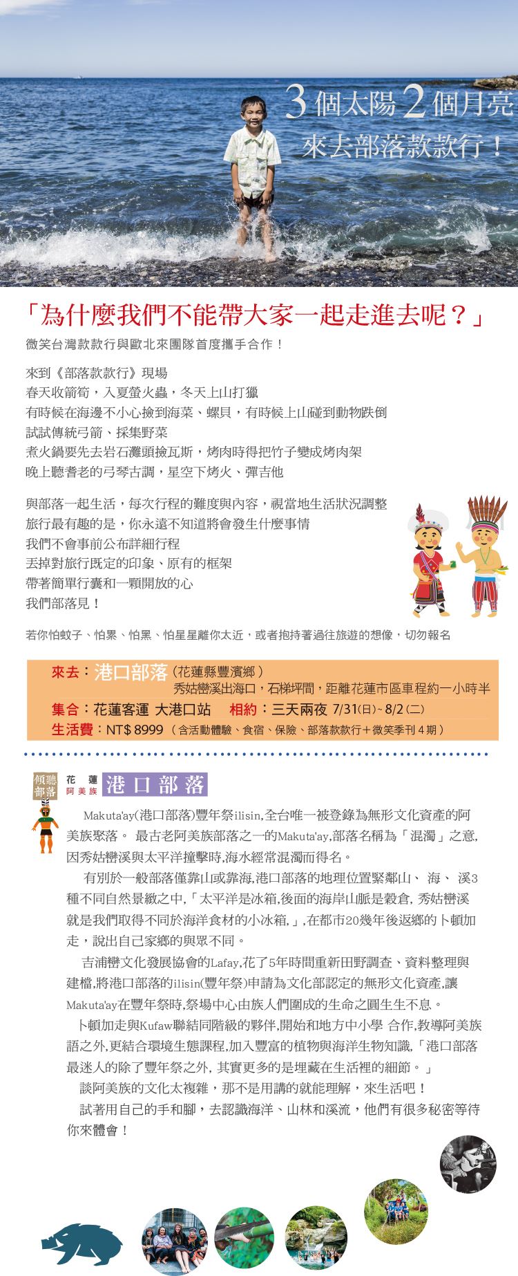 7.部落生活費包含:活動體驗、食宿、300萬旅遊平安險,旅遊醫療險(最高補支付30萬)、部落款款行1本,微笑季刊1年份(共4刊),