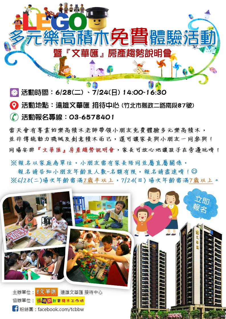 我們將於6/28(二)以及7/24(日)14:00~16:30 舉辦免費的多元積木體驗活動,