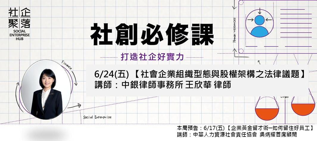 目前社會企業在台灣型態多元,甚麼是公司型社企?有限公司、股份有限公司以及最新的閉鎖型公司從法務的角度來看有何差別?成立公司型社企時應注意的流程以及小細節,通通都在社企聚落「社創必修課:法務講座」第五講,6/24(五)下午,社企聚落特別邀請中銀律師事務所的王欣華律師為大家解決成立社會企業時的法規疑問!