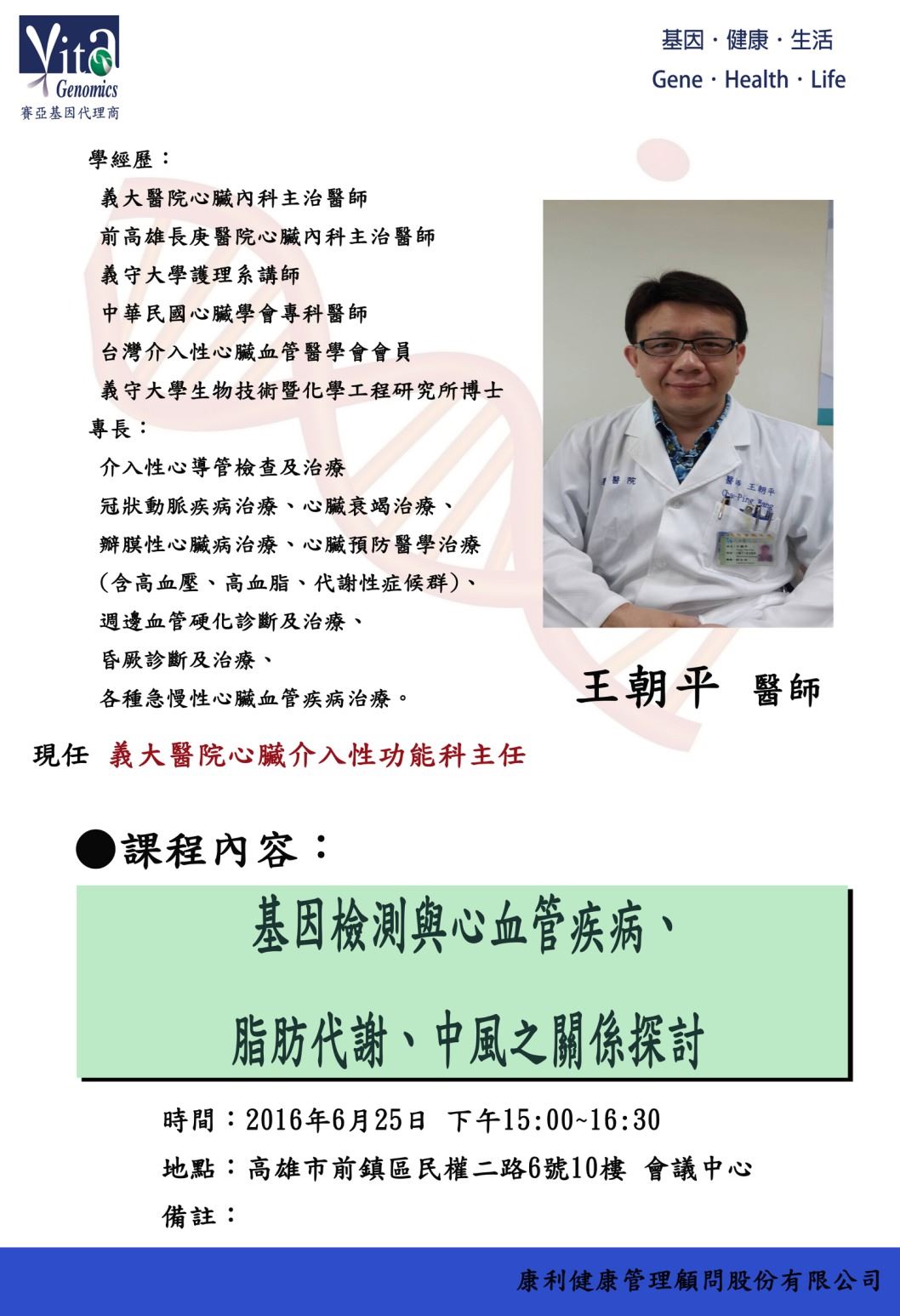 105年6月25日(六)我們邀請到🔆義大醫院心臟介入性功能科主任王朝平醫師🔆分享如何透過基因來了解我們的心臟健康,邀請您一起參加我們一年一度的演講盛事,講座全程免費,座位有限,請提早報名!