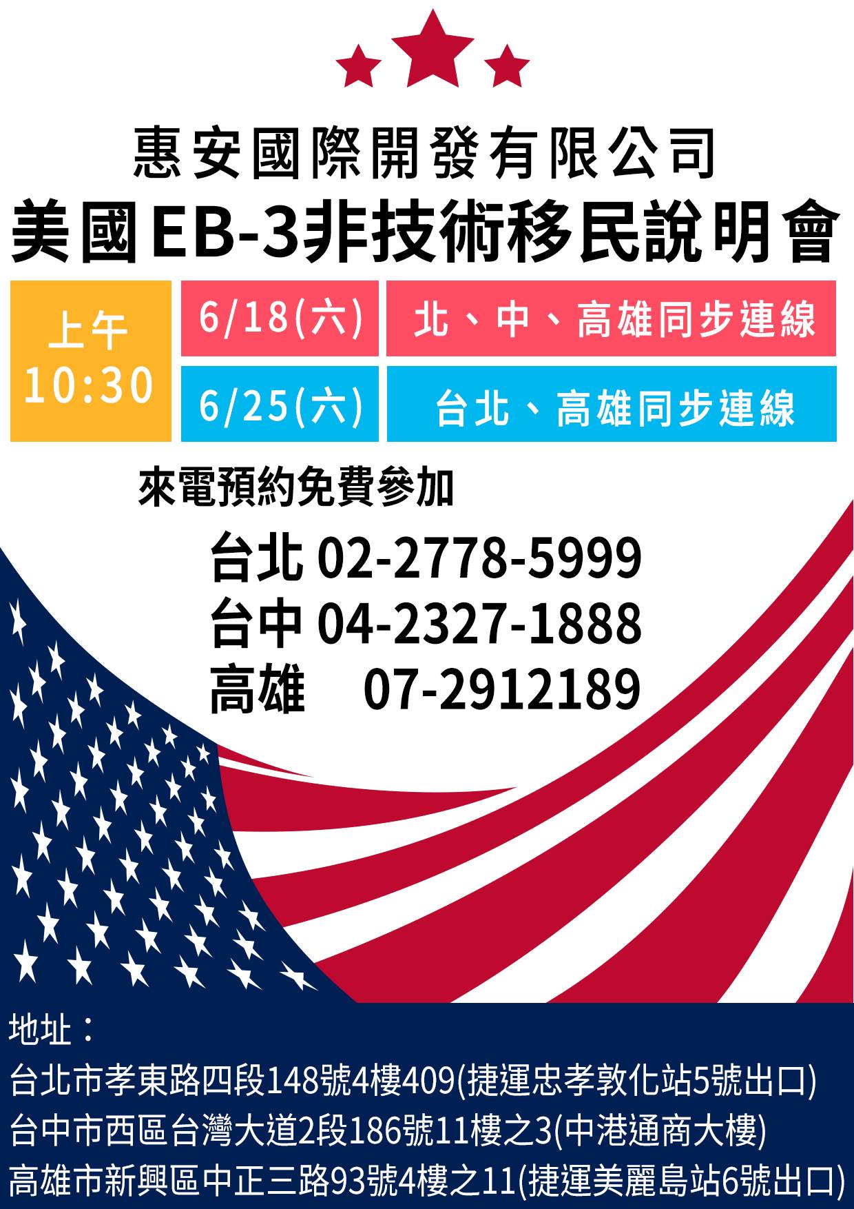 本週六6/18上午10:30有針對EB-3舉辦說明會,所以對美國移民有興趣的人,請打(04)2327 1888找Winnie 王小姐報名唷~免費入場,名額有限,趕快把握機會喔~