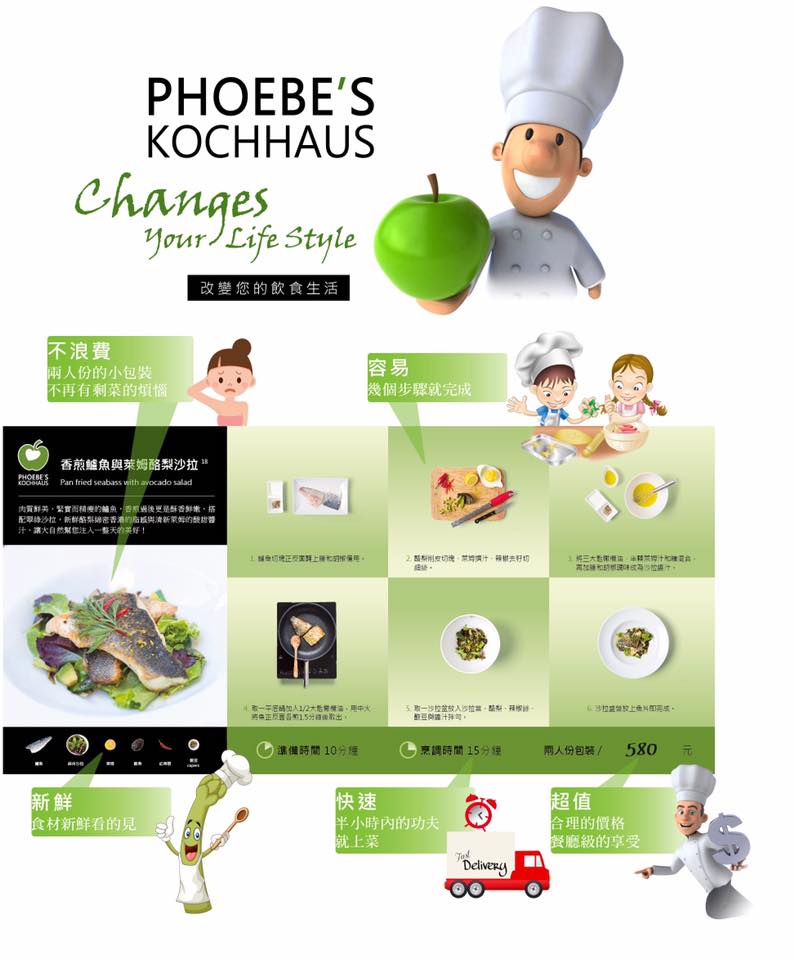 關於Phoebe's Kochhaus- 下廚不再傷腦筋:有食材就有食譜,不必再為「吃什麼」煩惱。 - 專業諮詢:造福懂吃懂喝、想學吃喝的朋友們,不但易於尋找所需食材,簡單新鮮看得見外,現場的專業服務與資訊,可充分獲取食物知識與購物樂趣。 - 完整時間標示:隨心選擇。 - 圖文烹調步驟:簡單明瞭,從容優雅上菜。 - 一次購足:所需食材與器具皆可一次搞定,免了勞頓奔波。 - 商品多元齊全:舉凡歐式材料、烹調用具、進口酒款等皆可輕易取得。 - 小包裝不浪費:所有菜單皆是兩人份包裝,輕鬆做菜輕鬆完食,美味不隔夜。