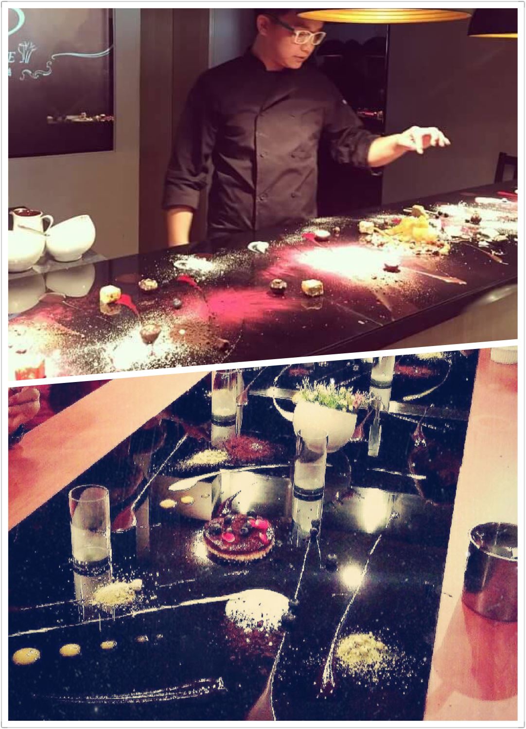 - 魔幻甜點秀 (分子奶酪、巧克力隕石、法式檸檬塔、新鮮水果與巧克力醬)
