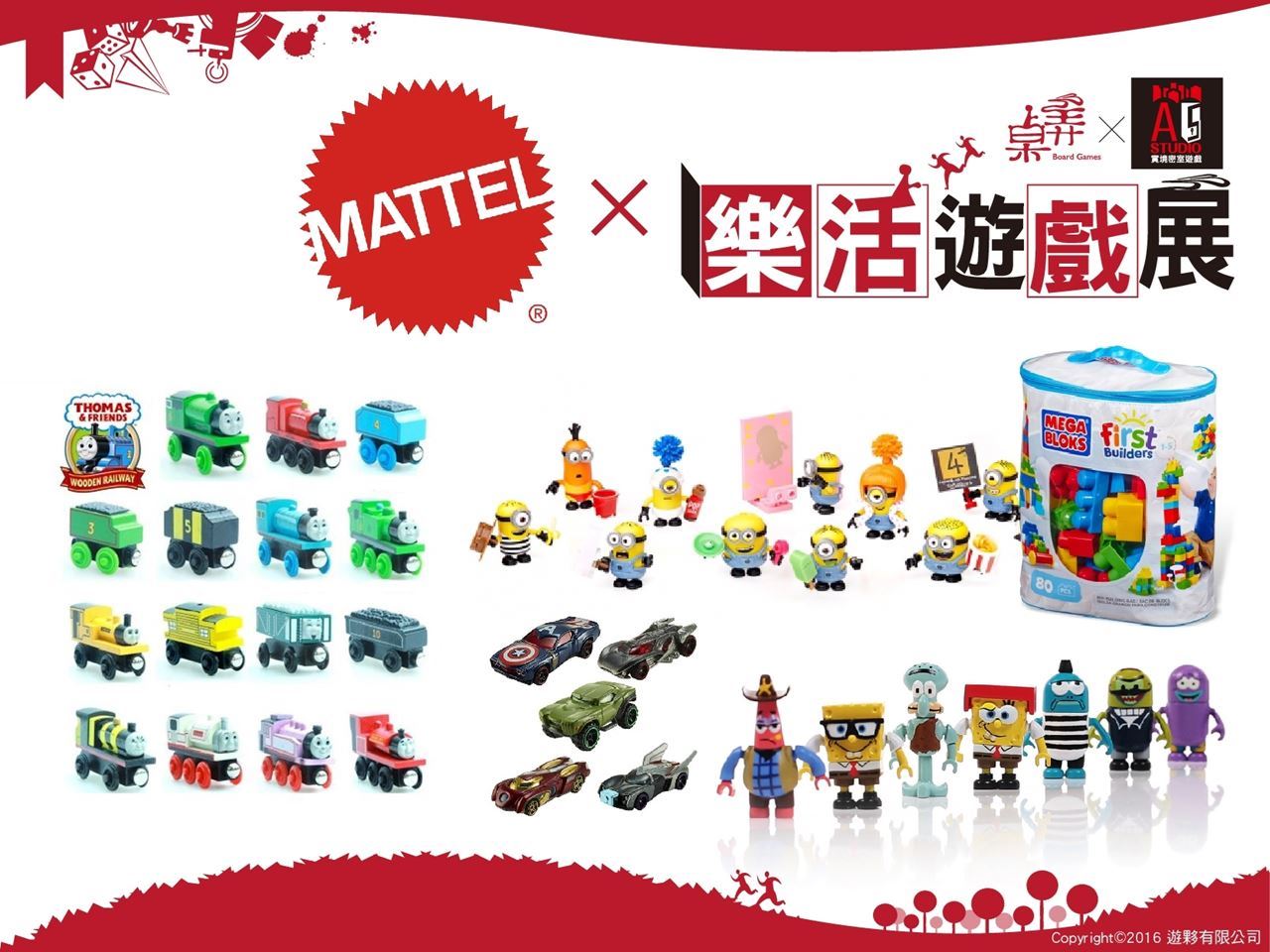 內有多款湯瑪士小火車、復仇者聯盟紀念款風火輪小汽車、小小兵造型小公仔、海綿寳寳造型小公仔,更有媽媽小孩都愛的MEGA美高積木!