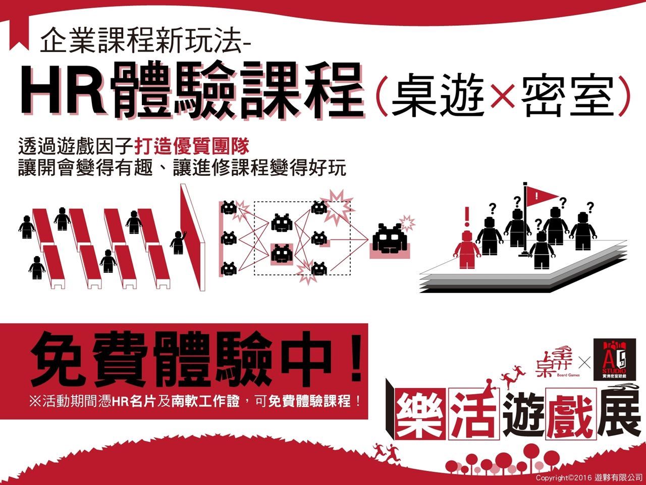 企業課程最夯新玩法,透過遊戲因子,讓團隊大大提升工作效能。凡持各公司相關名片及南軟工作證,可免費體驗課程喔!