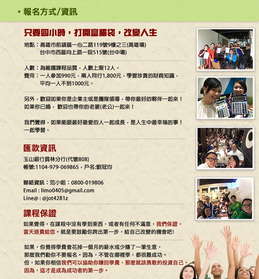 原價3980元,每場限量12名 人人都負擔得起的費用: 每人只要990元,兩人同行價只要1800元 學習珍貴的財商知識,一人平均不到1000元