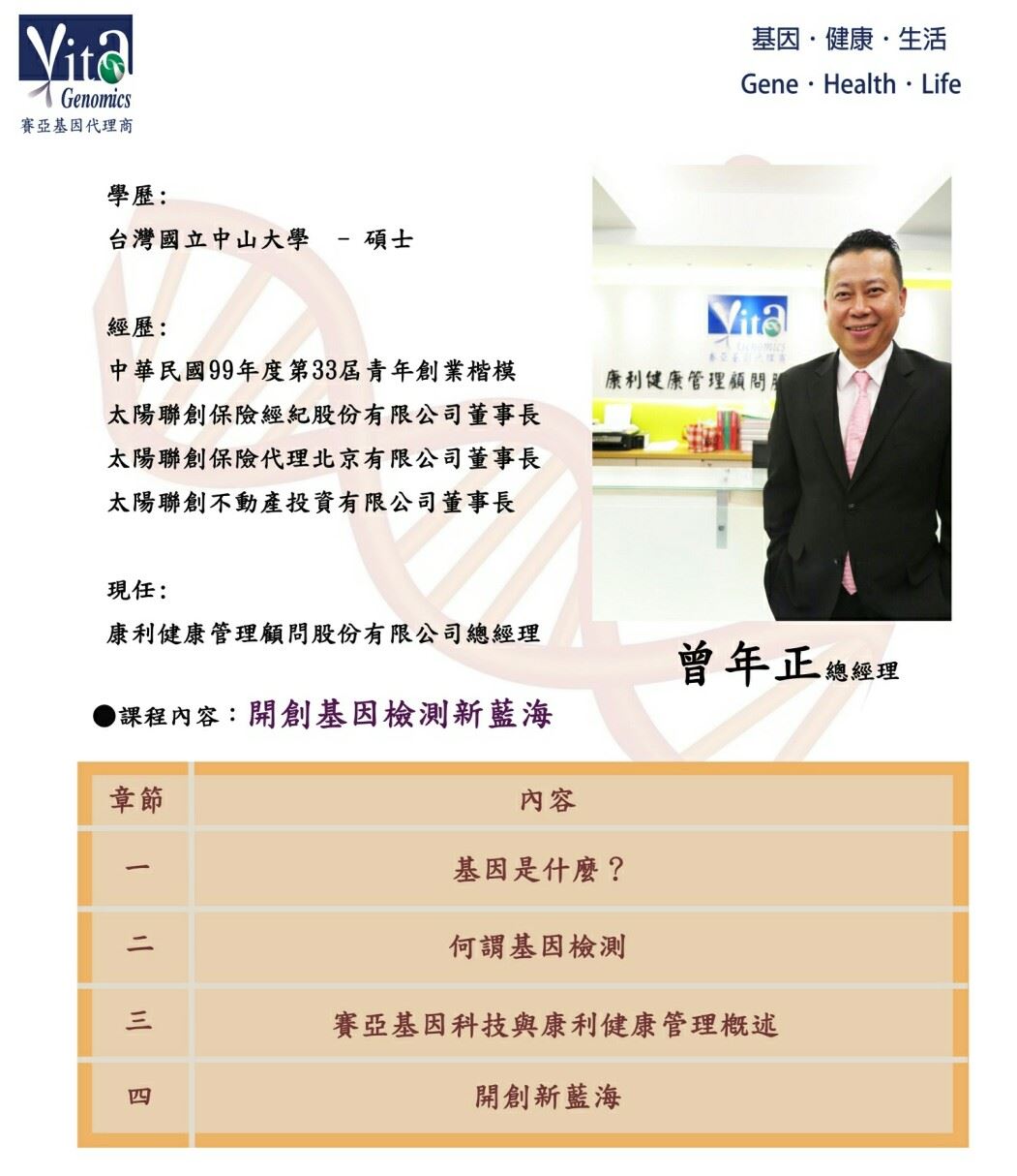 公司以創新、創意、創業的三創文化,發展專業的健康顧問團隊,透過客戶分享口碑的傳遞,善性循環的推廣,期望基因檢測深入每個家庭和每個人群,透過基因檢測的推動,讓所有的家庭和每個人都能擁有一本終生享用的身體使用說明書。