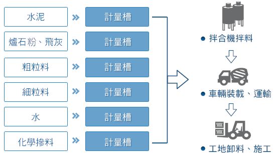 預拌混凝土係由水泥、水、細粒料、粗粒料及選用之摻料(可能包括高爐石粉、飛灰、化學摻料)等四至五種以上性質不同的材料於工廠內預先拌和而成,期間經過原料生產、運送、儲存及生產拌和,並經由預拌車運送至工地現場。