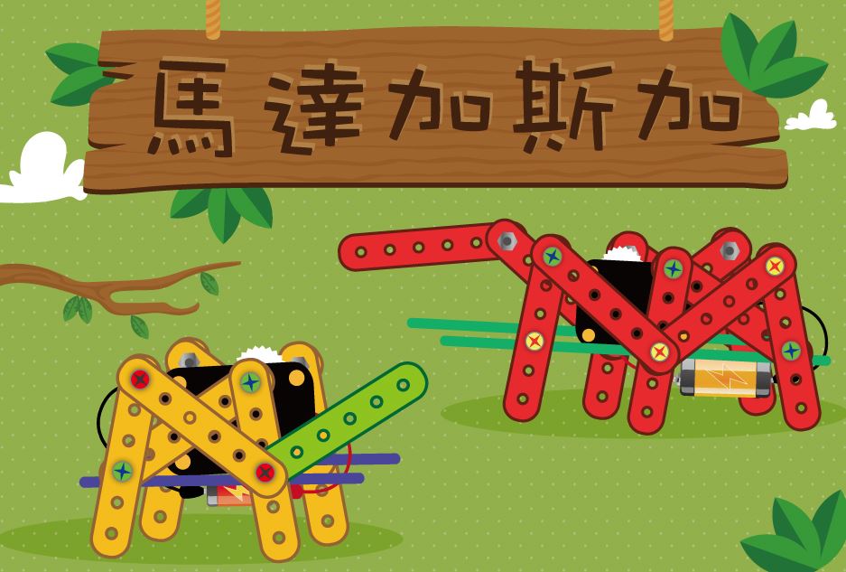 課程簡介:馬達加斯加是綜合應用發電原理+馬達+機械應用....等已經學習過的科技力模仿各種動物的動作,舉凡貓、狗、馬、昆蟲...等,都是我們創造的物件,我們將學到如何將馬達減速並增加力道,此外我們也學會將齒輪組所輸出的圓周運動轉換成直線運動,接著我們就開始製作屬於自己的第一隻仿生獸,同學們也可以試著增加造型與顏色,做出自己的第一隻機器寵物。