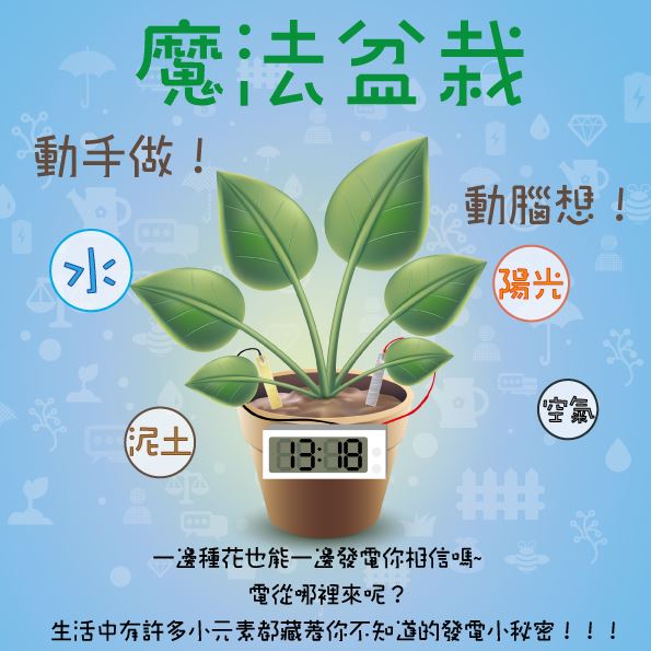 課程簡介:電子鐘不需要裝電池也可以運轉,想一想電還可以從那裡來呢?其實泥土、食物、水都可以用來發電喔!課程中將透過有趣的科學實驗,並介紹各式各樣的發電原理,讓你瞭解自然能源的科學原理,另外還可以自己動手製作一個專屬的盆栽電子鐘帶回家。