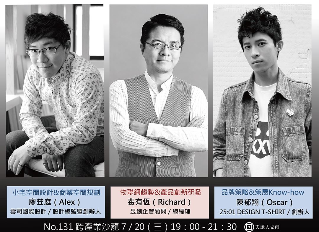 跨產業沙龍,一個專業人士的人脈交流與產業學習平台。於每週三19:00-21:30固定籌辦。每場次皆邀請三位不同領域講師分享產業工作與內容,打造北台灣不同產業人士的交流空間。產業涵蓋領域包含:外商、大型企業、成功創業家、藝術工作者等(e.g. Intel, TI, 阿里巴巴, 建築事務所, 創投, 交易室, 政府部門等,每週持續更新),每個小週末的夜晚,來到天地人文創,一次瞭解三方產業、迅速累積跨領域合作與創新動能!(了解更多> 歷屆跨產業沙龍 )