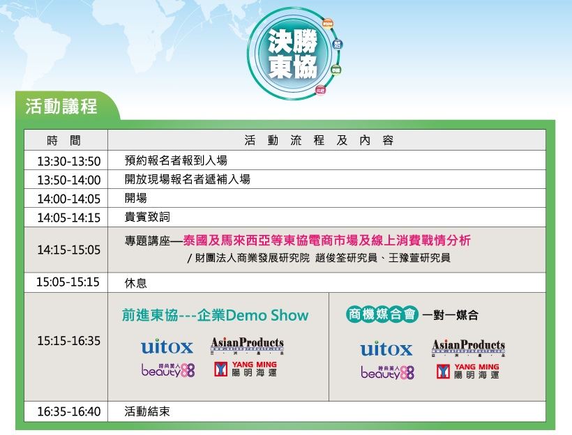 財團法人商業發展研究院(以下簡稱本院)因舉辦「決勝東協!電商新藍海戰情分析暨平台X供應商媒合會(高雄場)」,向臺端蒐集個人資料,依個人資料保護法令及本院個人資料保護規章,於蒐集個人資料前,向臺端告知下列事項。臺端可自由選擇是否提供相關個人資料,惟台端若拒絕(勾選不同意或未勾選者)提供相關個人資料,本院將無法受理報名及後續相關作業