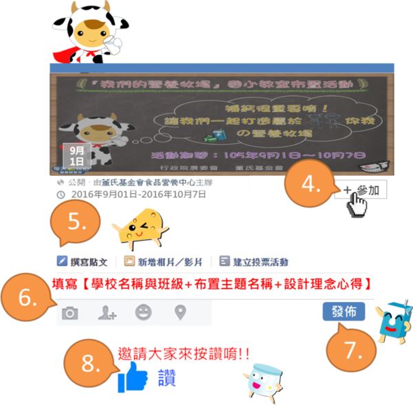 完成布置後,請將作品拍照並打卡上傳至「我們的營養牧場」粉絲團活動頁(https://goo.gl/fM0xjg),格式需求及上傳辦法請見第二頁附件說明;上傳成功後就可以邀請親朋好友來幫您的作品按讚