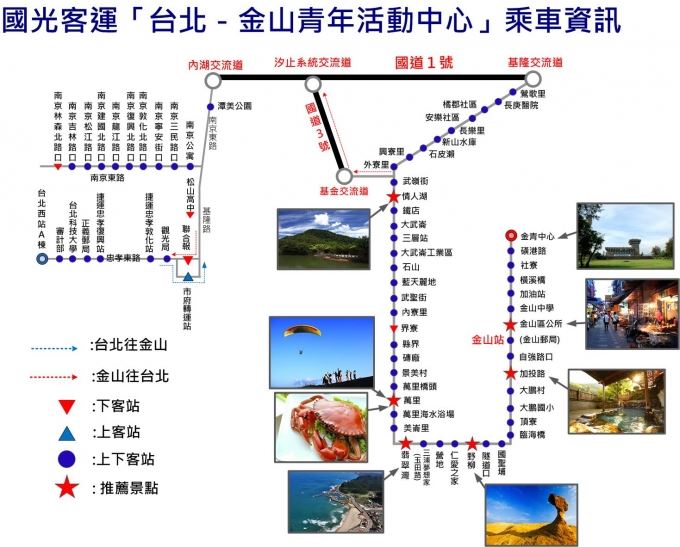 3.國光客運台北總站搭乘台北往金山、金青中心班車,於「金山郵局-金山站」站下車。