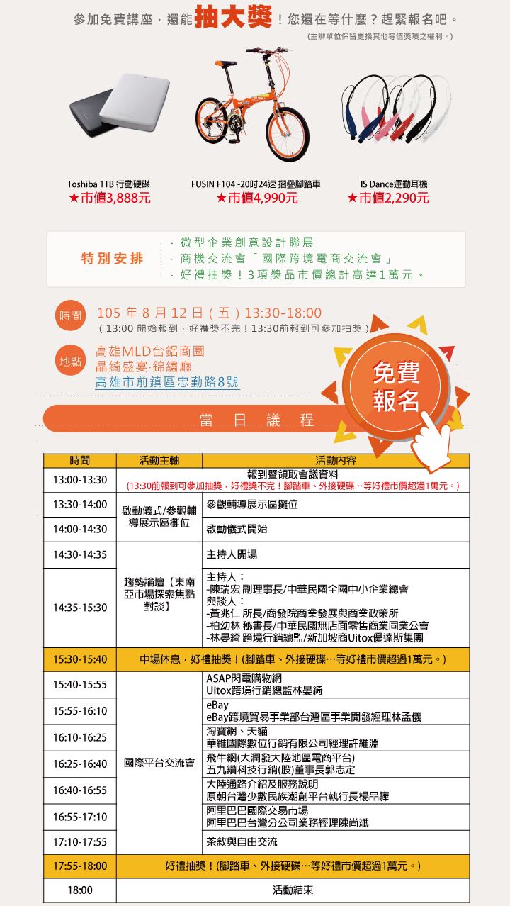 若報名程序上有任何問題,或有無法報名的問題,歡迎撥打0800-05-1638,我們會盡快協助您處理,謝謝!因活動當天有與國際跨境平台媒合難得的機會,敬請您將公司名稱、欲媒合資訊填寫清楚~報名成功將去信通知您!謝謝!13:30前報到還可參加市值高達1萬元獎品(腳踏車、外接硬碟等)抽獎!這麼好康的活動,千萬別錯過!