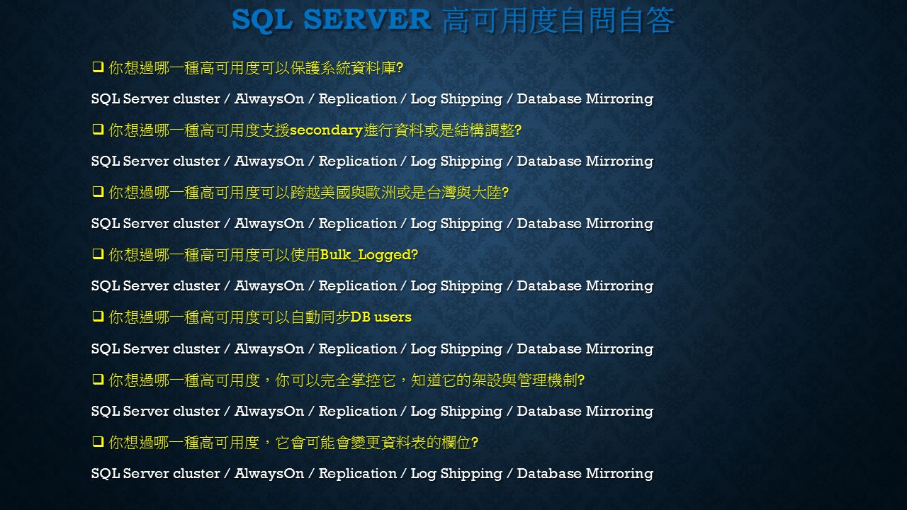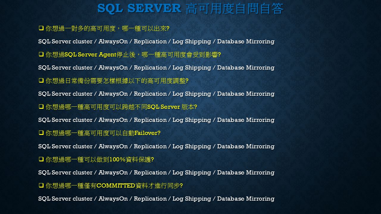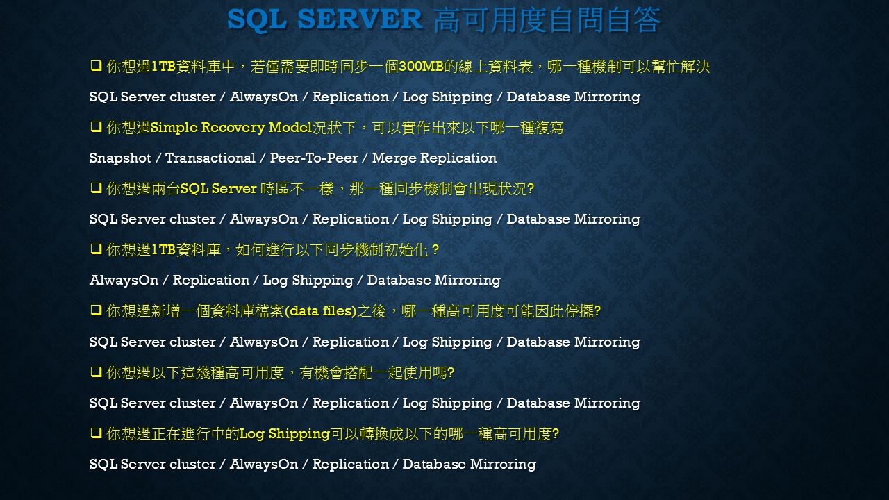 SQL Server 高可用度舉凡Windows Cluster、SQL Server Cluster、AlwaysON、Replication、Log Shipping與Database Mirroring,都是大家常聽到的名詞術語。它們每一個都是一台超跑,駕馭自如可以節省你很多資料同步與災難復原的時間,藉由此讀書會,可以讓想要了解SQL Server的高可用的社員,評量你對這些超跑掌控的程度。