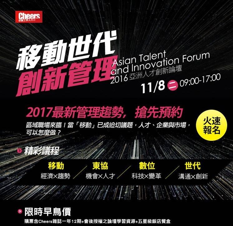 《Cheers快樂工作人雜誌》將於2016年11月8日於台北舉辦「亞洲人才創新論壇」,開啟企業與人才對話的橋梁,掌握世代管理新貌。