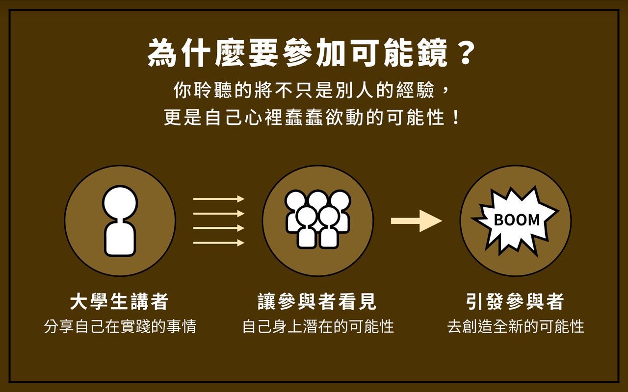 可能鏡是「可能性 Probability」團隊的一個系列活動策展,旨在邀請大學生年齡、闖盪出不同可能性的非典型人物,透過他們的經驗分享,還原出他們當初做出這些選擇背後的「WHY」;並讓參與者藉由分享者,看到自己身上其實也潛藏的可能性,進而獲得勇氣、也踏上創造自己可能性的旅程!