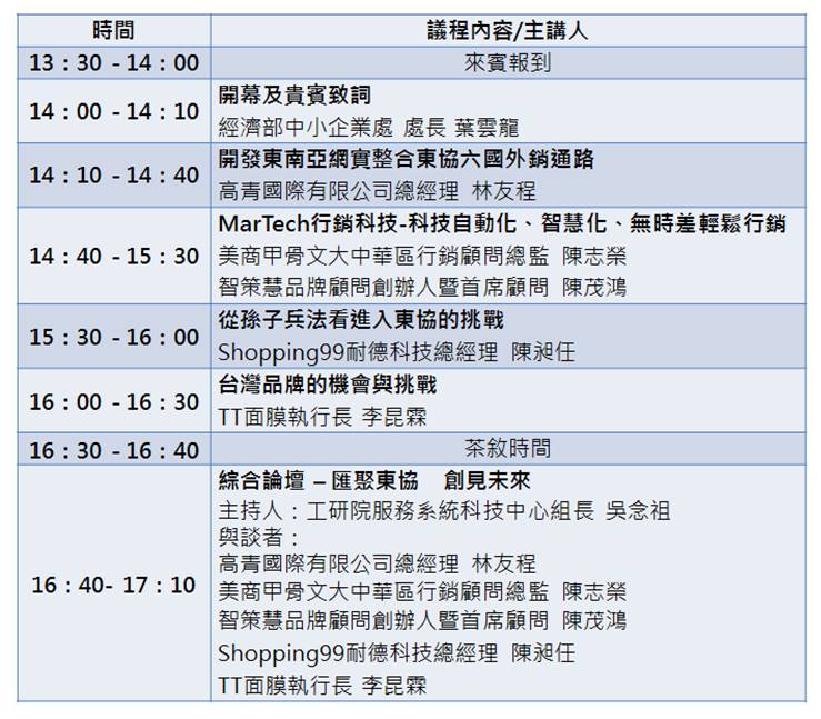 經濟部中小企業處為協助企業打通全球價值鏈體系,提高產品或服務附加價值,強化設計研發、產品製造、通路銷售、國際行銷等創新能力,促使企業品牌提前布局東協,搶攻南向大商機。特邀請跨國電商營運專家高青國際,傳授打通無國界電商貿易及匯聚價值鏈秘笈;全球行銷雲整合技術領導美商甲骨文、亞洲知名品牌顧問公司智策慧,說明全球最夯的MarTech(Marketing Technology)行銷科技應用與品牌永續智慧;以及成功切入菲律賓市場的女性購物網站-Shopping99、唯一進駐法國的台灣自有品牌TT面膜,現身分享國際行銷成功經驗,歡迎一起前來聚焦新南向,創見大未來!