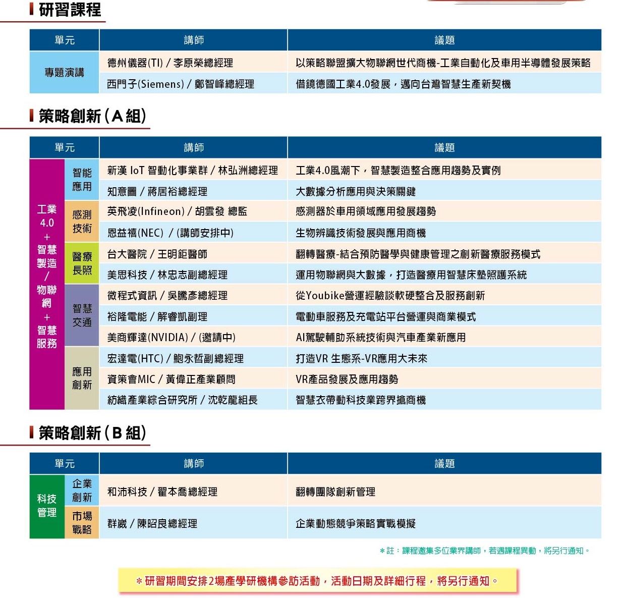 》本研習計畫含專題演講、策略創新A組課程、策略創新B組課程及參訪活動。