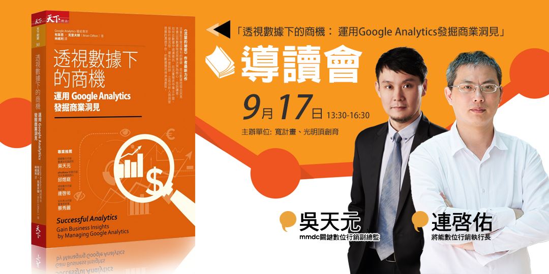 ※ 活動二:13:30-16:30 『透視數據下的商機:運用Google Analytics發 掘商業洞見』導讀會 講師:吳天元/連啟佑 老師