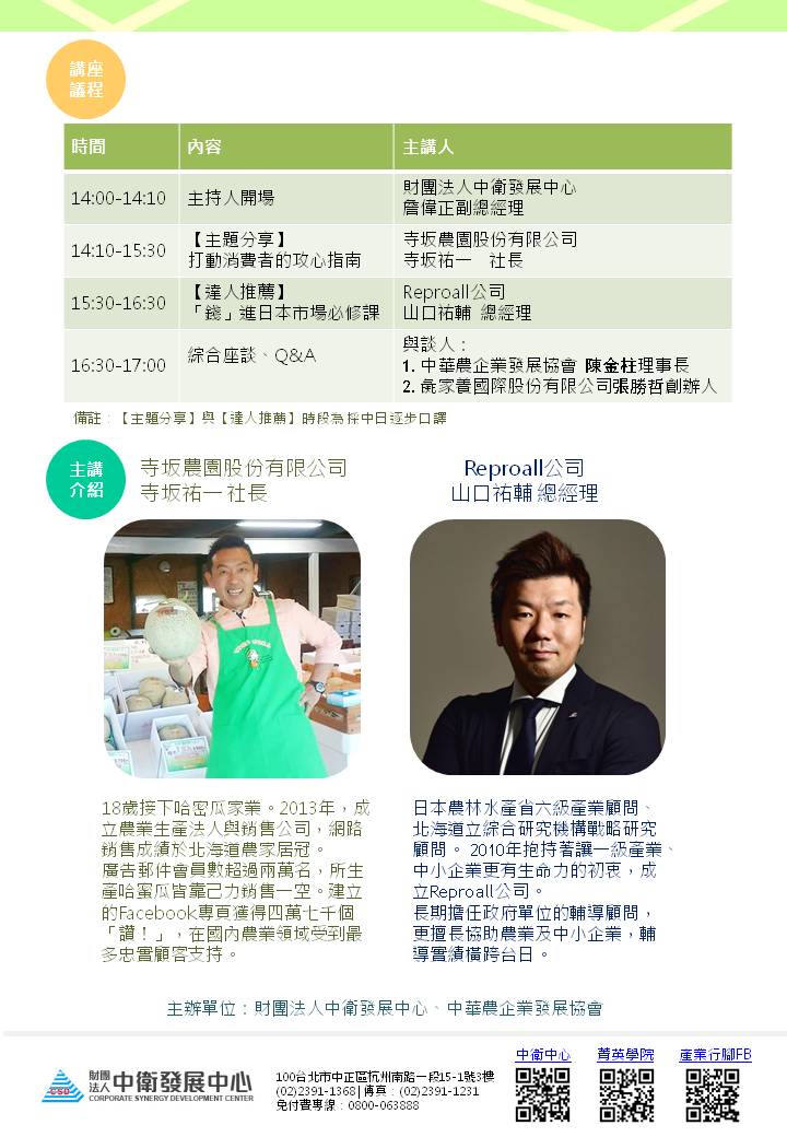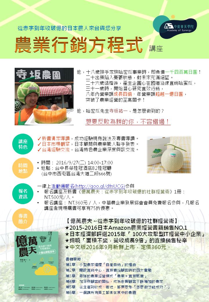 •報名講座: NT.360元/人,中華農企業發展協會會員免費報名參與,凡報名講座者,現場購書可享有75折優惠($270元)。