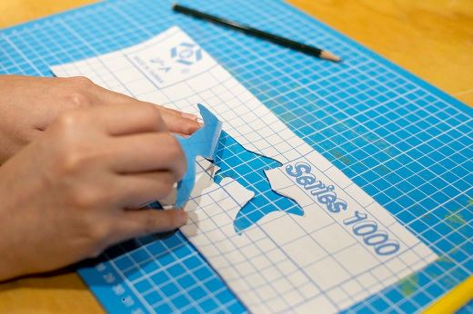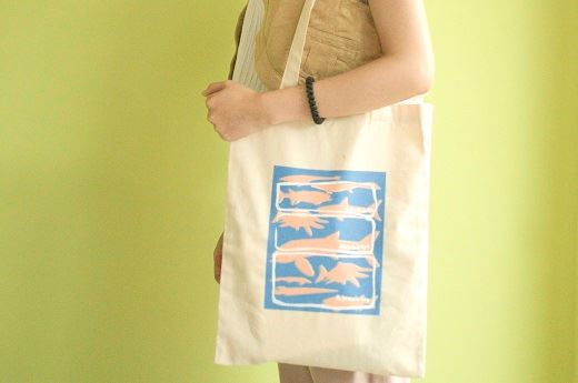 相同的生物剪影,利用不同的方式呈現就可以有完全不同的感覺,加上數字,讓肩背包在兩個表面之間產生時間感。利用型紙孔版的技巧,肩上的背包多了自主的設計圖案,在設計與實作之間,體會從製作到完成的手作趣。