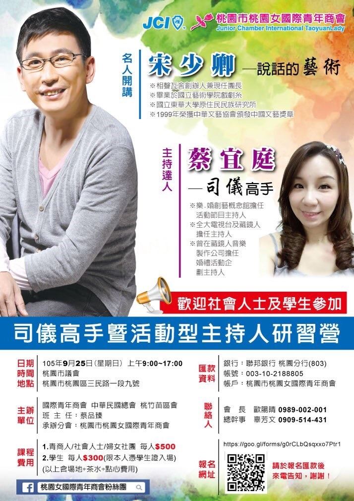 本研習營特地邀請說話高手宋少卿及活動型主持界的達人蔡宜庭來教大家學習如何成為具有說話表達魅力