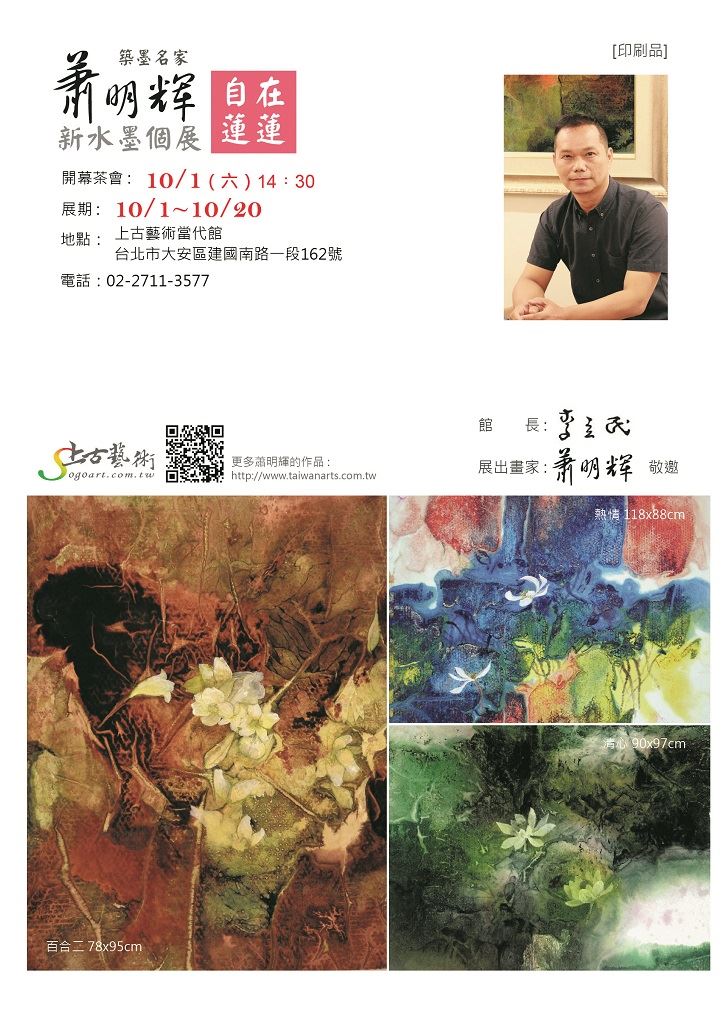 第一次在台北展出,也是首次參與藝術夜拍會,蕭明輝希望與來賓結緣,讓大家能看到他更多精彩的創作。9月24日星期六晚間6點,參與夜拍會的朋友,只要在上古藝術粉絲專頁附照片打卡。即可於10月1日星期六14:30蕭明輝【自在蓮蓮】開展茶會領取結緣墨寶(一才市價1萬元),機會相當難得,敬請預約02-2711-3577#13。
