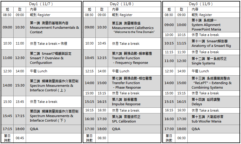 Rational acoustics所提供的Smaart V8在歐美國家被視為高度專業的工程技巧實務課程,團體課程每人學費高達700美金,且對教學場地有著相對高門檻的技術限制。本次工作坊借重Legacy Taipei已建置與國際接軌的合格音響系統設備與紮實的教學課程規劃,希望此建立起台灣音響工程正確的工作知識與流程。