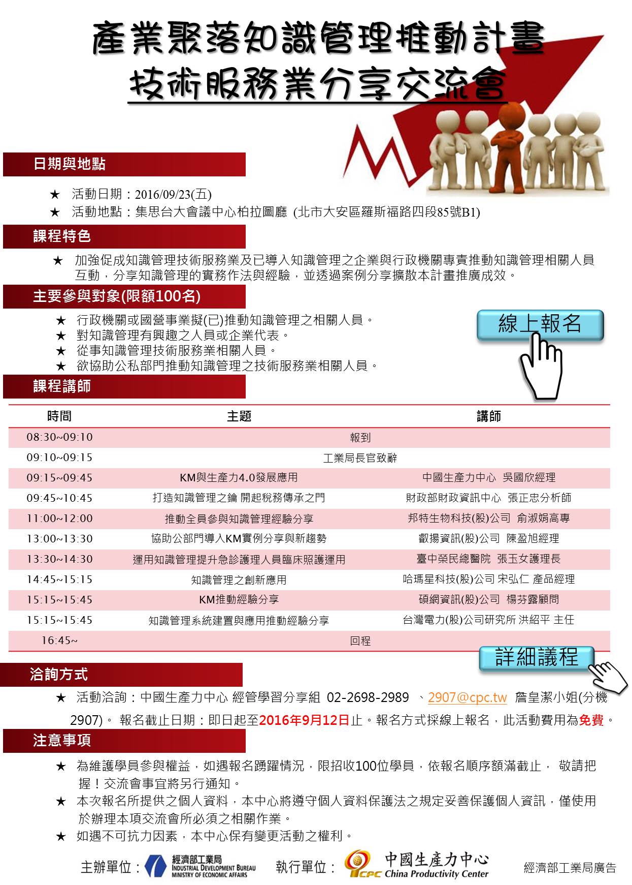 身處於知識經濟時代,知識管理已成為各企業不可或缺的工具,也是大數據、智能生產之基本工具。為促進各產業之知識管理交流,將辦理知識管理技術服務交流會,以期帶動公、私部門知識分享、學習之效。