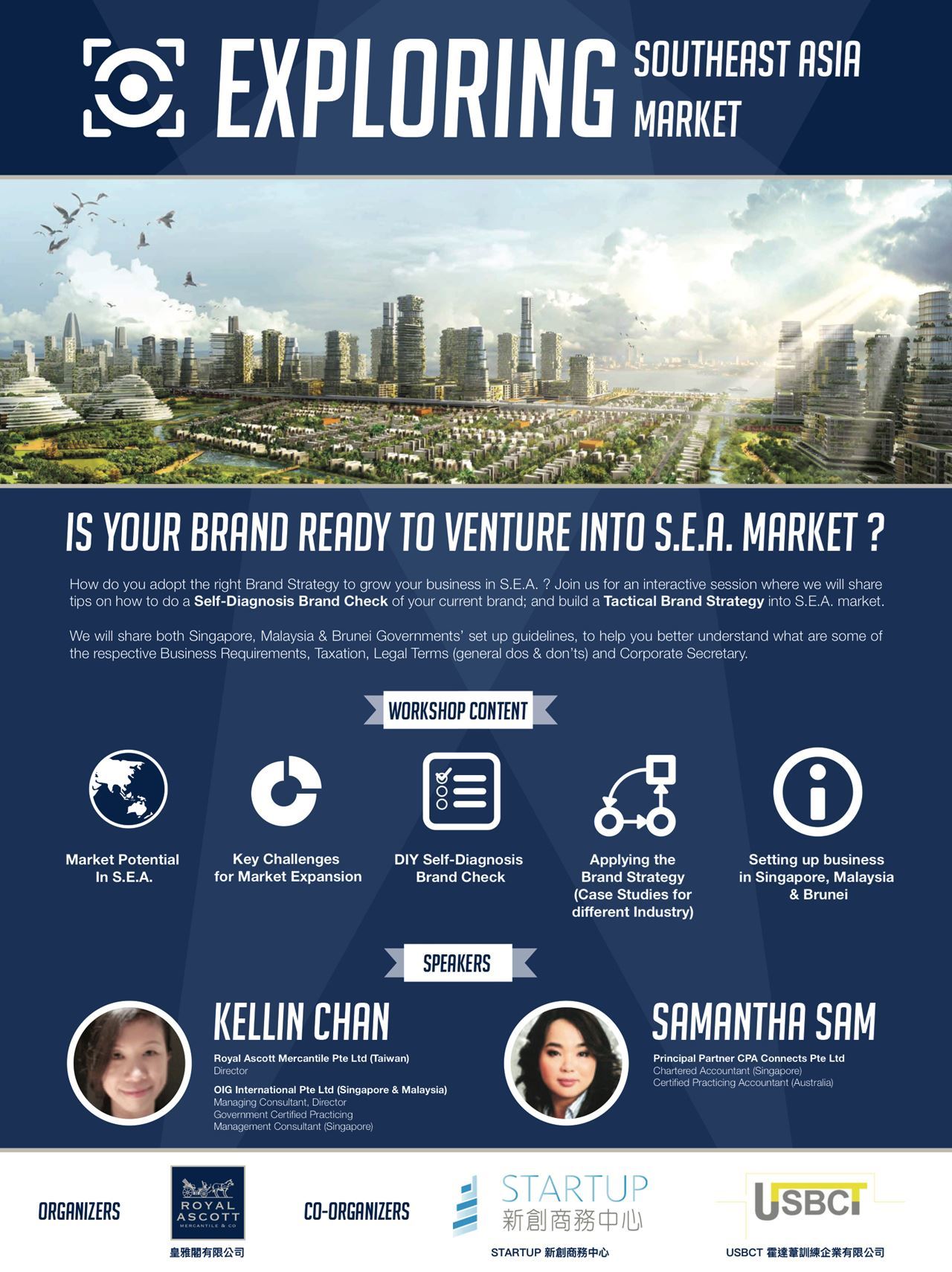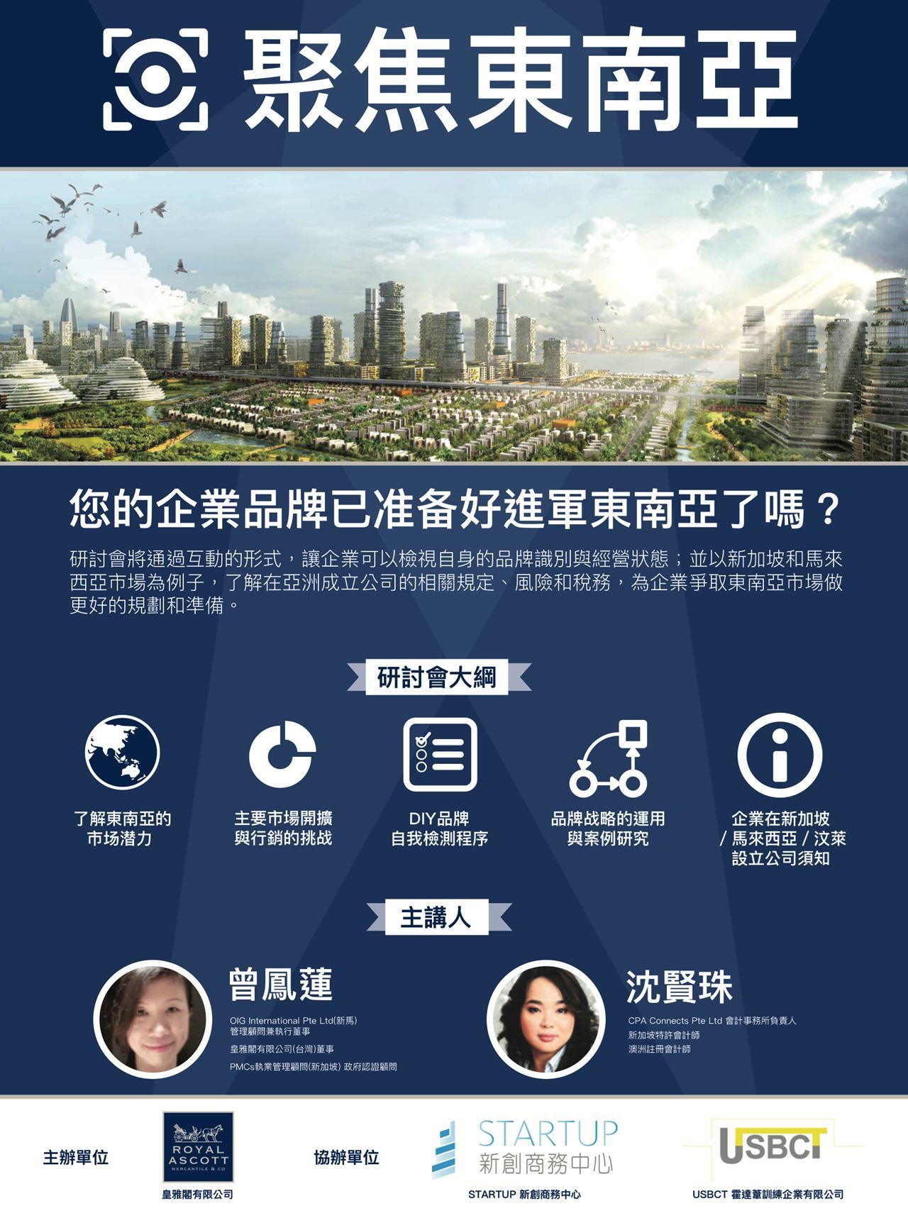 | 14:00 - 15:30 | 您的企業已準備好進軍東南亞了嗎? -了解東南亞市場潛力 -主要市場開闊與行銷的挑戰 -DIY 品牌自我檢測程序 -品牌戰略的運用與案例研究 | 曾鳳蓮 Kellin Chan |