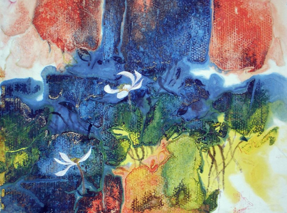 對蕭明輝來說,畫「蓮花」是非常自適自在的,其筆下的蓮花著重於情感之流露,透過色彩、肌理變化衝擊視覺感官,在廣袤的繪畫天地中盡顯自適。蓮花是主角亦是配角,在不同的情境象徵不同的情感,陶醉於墨彩與水撞擊交匯出的繽紛世界。