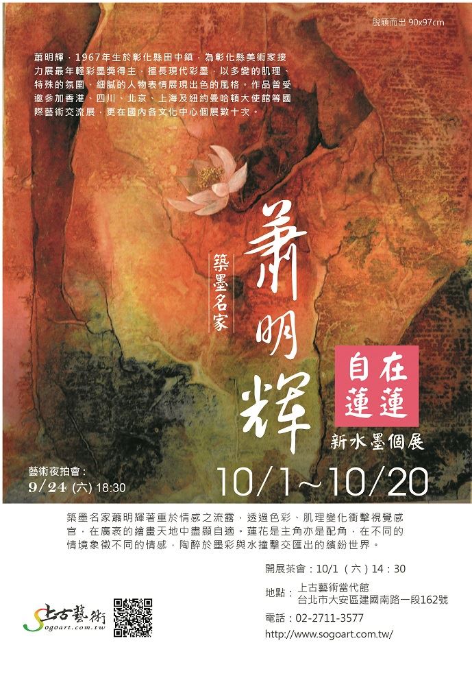 第一次在台北展出,也是首次參與藝術夜拍會,蕭明輝希望與來賓結緣,讓大家能看到他更多精彩的創作。9月24日星期六晚間6點,參與夜拍會的朋友,只要在上古藝術粉絲專頁附照片打卡。即可於10月1日星期六14:30蕭明輝【自在蓮蓮】開展茶會領取結緣墨寶(一才市價1萬元),機會相當難得,敬請預約02-2711-3577#13。