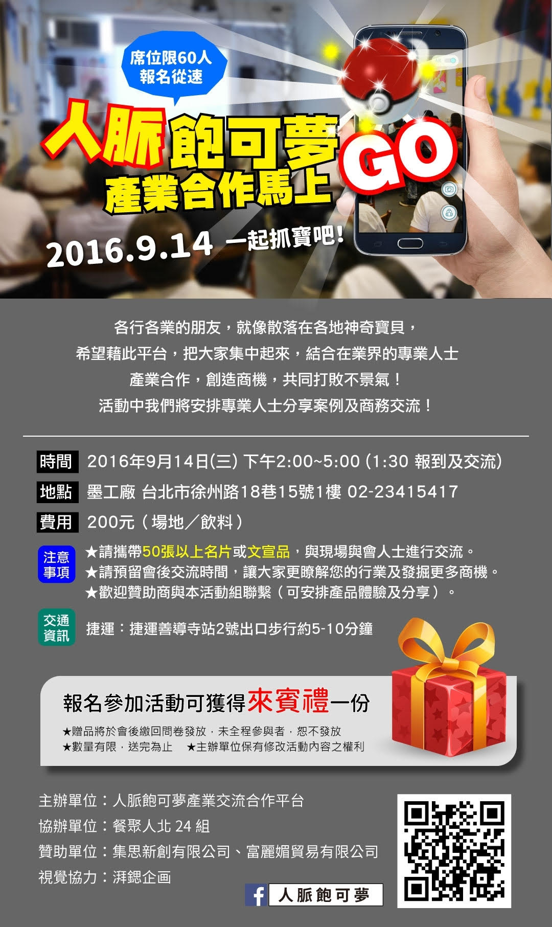 各行各業的朋友,就像散落在各地神奇寶貝, 希望藉此活動平台,把大家集中起來,結合在業界的專業人士 產業合作,創造商機,共同打敗不景氣!活動中我們將安排專業人士分享案例及商務交流! 日期:2016年9月14日 星期三時間:下午1:30~5:00地點:墨工廠 台北市中正區徐州路18巷15號1樓費用:200元(場地/飲料)貼心小提醒:★請攜帶50張以上名片或文宣品,與現場與會人士進行交流。★請預留會後交流時間,讓大家更瞭解您的行業及發掘更多商機。★歡迎贊助商與本活動組聯繫(可安排產品體驗及分享)。